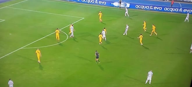 Addirittura, innovazione interessante ma pur sempre testimone della “larghezza” degli spazi tra i nostri, spesso SCOGNAMIGLIO restava solo dietro a impostare con BETTELLA e DRUDI subito più avanti ma larghissimi sulle fasce sulla linea di KASTANOS e MEMUSHAJ (o, a turno, MACHIN), mentre CIOFANI e CRECCO avvolgevano l’avversario ponendosi a fare le ali avanzate (in linea con MACHIN o, a turno, MEMU): un 1-4-2-3 in fase offensiva.