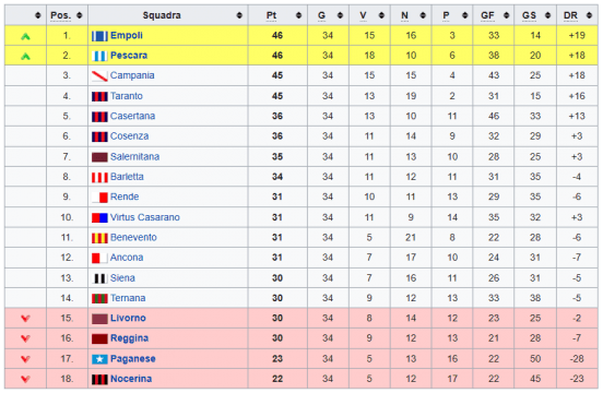 Vincemmo il campionato a pari punti con l’Empoli e salimmo in serie B. Il Livorno retrocesse in base alla classifica avulsa (nella quale arrivò un punto sotto il Siena e a pari punti ma un solo gol di differenza reti in meno rispetto alla Ternana).