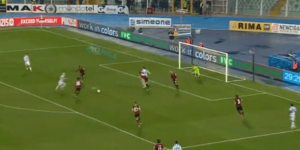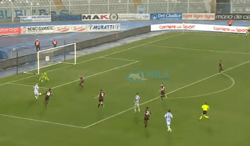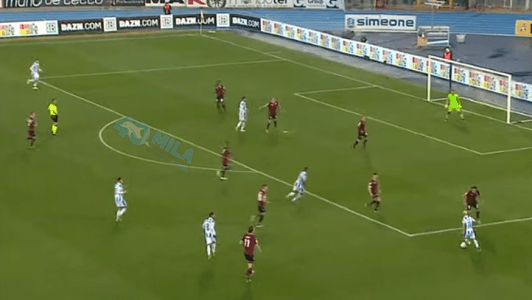 Ma poi, quale 4-3-2-1? La sua forza originaria era nel tenere i giocatori di centrocampo vicini a fraseggiare. Addirittura, ZAURI diceva loro di stare appiccicati a 2 a 2. Invece, la squadra si allunga e i passaggi non sono più fraseggi stretti… E infatti vengono intercettati (come sta per succedere qui nella foto):