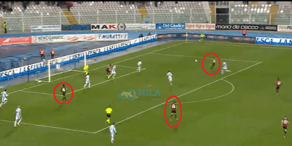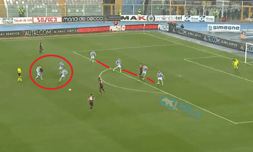Certo che se gli inserimenti avversari vedono i nostri centrocampisti o trequartisti rincorrerli in ritardo, c’è il motivo della “fissa” a non far retrocedere le ali (nel 4-3-3) o i trequartisti (nel 4-3-2-1) di default sulla linea dei 3 centrocampisti fin da inizio azione. E così, i nostri 3 della mediana si ritrovano spesso soli e non coprono le fasce:
