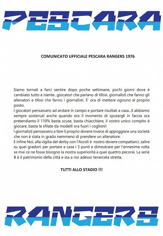Comunicato che mi ricorda molto il modus operanti dei giornalai locali.. due righe timide per il vero responsabile e un fiume in piena verso chi centra poco e niente. Il derby con l ascoli è sempre stato all acqua di rose. Non ricordo scontri e crani aperti..mo lo si vuol far passare per la partita della vita? Non ci sto. Stasera la priorità è la contestazione. Frega un cazzo della categoria e delle pecore. ULTIMO TRENO RAGAZZI…ULTIMO