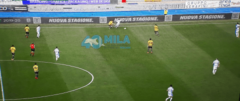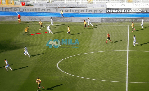 Poi l’idea, come anche confermato dal tecnico biancazzurro, è che la palla la si facesse passare alle spalle dei “mediani” avversari, tra le loro linee di centrocampo e difesa, dove GALANO (soprattutto) – ma anche MEMUSHAJ e PUCCIARELLI nella fascia sinistra – venivano incontro a ricevere palla e/o s’inserivano.