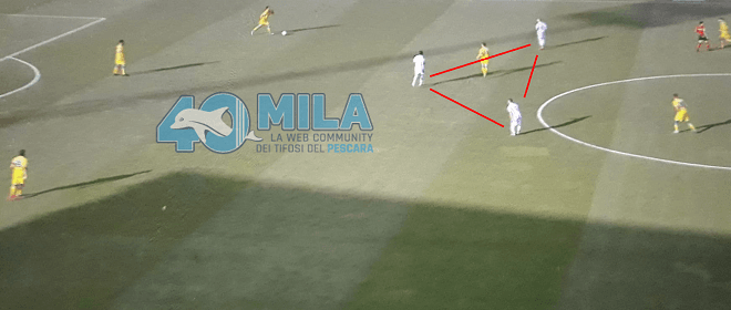 Le due “prime linee” (il “3-4”) le avevamo già viste nella precedente analisi tattica (incluso la funzione dei “due mediani”), per cui ora possiamo limitarci ad inquadrare visivamente il triangolo “2-1” d’attacco (CLEMENZA-PUCCIARELLI + MANIERO):