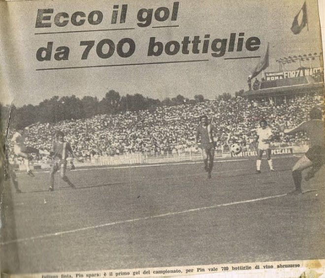 La prima decina di minuti sarebbe la classica fase “di studio”, ma forse Nobili & C. prendono un po’ troppo alla lettera questa definizione, visto che restano a guardare come impietriti. Di fatto, il Napoli si vede praticamente “costretto” a dominare e a segnare. Nemmeno Zucchini si esime dal gioco corale delle “belle statuine”, indugia con la palla tra i piedi (e non si sa perché) e se la fa togliere come un principiante dall’azzurro Livio Pin che, a quel punto, deve solo sparare in porta, potendo contare anche sulla non-presenza di Piloni, a sua volta “incantato” dal bel cielo terso, il sole che ricama merletti di luce e i passerotti che vibrano nell’aria melodie di settecentesca memoria. E così, l’ala destra napoletana si porta a casa anche le 700 bottiglie del nostro vino, che l’enologo Carmine Festa ha messo in palio proprio per chi avesse segnato il primo gol del campionato; magari con la speranza (o illusione) di darle ad un giocatore del Pescara … sì, figuriamoci!