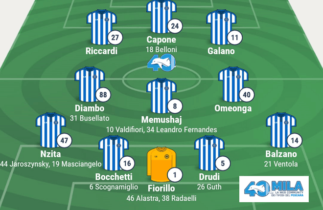 A disposizione – Portieri: 46 ALASTRA. Difensori: 19 MASCIANGELO, 6 SCOGNAMIGLIO, 21 VENTOLA, 44 JAROSZYNSKI , 26 GUTH. Centrocampisti: 34 FERNANDES, 31 BUSELLATO, 10 VALDIFIORI. Attaccanti: 18 BELLONI, 7 BOCIC, 29 ARLOTTI.