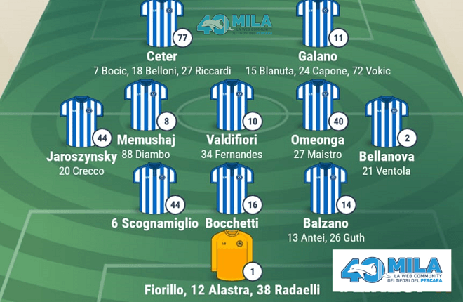 Pescara – ‎1 FIORILLO, 14 BALZANO (81′ GUTH), 16 BOCCHETTI, 6 SCOGNAMIGLIO, 2 BELLANOVA, 40 OMEONGA, 10 VALDIFIORI (67′ FERNANDES), 8 MEMUSHAJ (67′ CRECCO), 44 ‎JAROSZYŃSKI, 11 GALANO (32′ MAISTRO), 77 CETER (81′ CAPONE). Allenatore: Roberto BREDA.