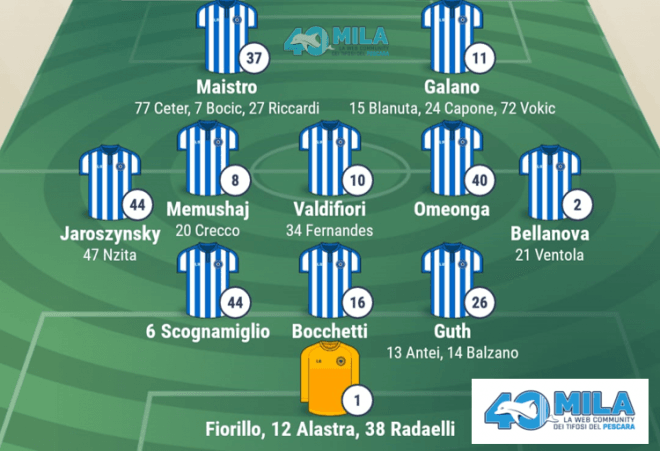 Pescara – 1 FIORILLO, 26 GUTH, 16 BOCCHETTI, 6 SCOGNAMIGLIO, 2 BELLANOVA, 40 OMEONGA, 10 VALDIFIORI, 8 MEMUSHAJ, 44 JAROSZYŃSKI (64′ NZITA) , 11 GALANO (87’ CRECCO), 37 MAISTRO (83’ CETER). Allenatore: Roberto BREDA.