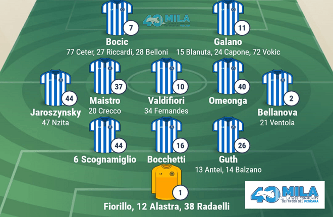 A disposizione – Portieri: 46 ALASTRA, 38 RADAELLI. Difensori: 13 ANTEI, 14 BALZANO, 21 VENTOLA, 47 NZITA. Centrocampisti: 20 CRECCO, 34 FERNANDES. Attaccanti: 15 BLANUTA, 24 CAPONE, 27 RICCARDI, 28 BELLONI, 72 VOKIC, 77 CETER.