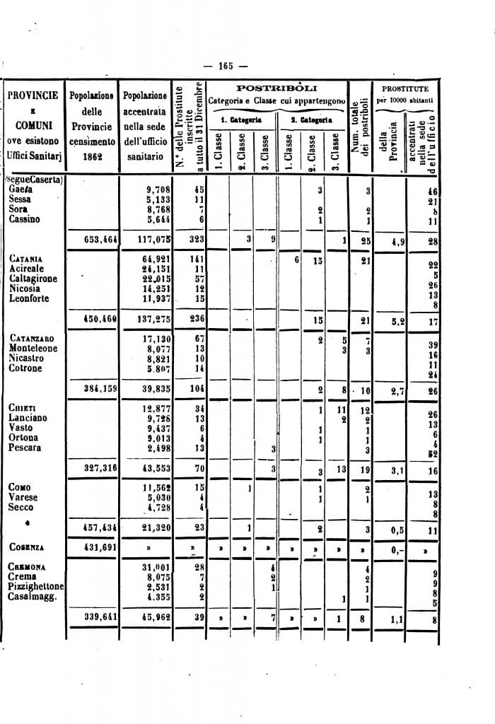 Statistiche tratte da “Sorveglianza sulla prostituzione, ecc.”, P. Castiglioni, Roma, 1872