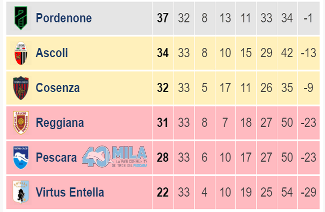 - Arrivando a pari punti con il Cosenza e con la Reggiana, la classifica avulsa sarebbe a nostro favore anche solo con due pareggi contro le stesse nei prossimi confronti diretti: Pescara 6 punti (una vittoria contro la Reggiana e 3 pareggi), Reggiana 5 (una vittoria contro il Cosenza, una sconfitta contro il Pescara e due pareggi), Cosenza 3 (due pareggi con il Pescara, un pari e una sconfitta contro la Reggiana). Però, se non recuperiamo punti a Reggiana (che ne ha 3 più di noi) e Cosenza (a +4, come sopra detto) nei confronti diretti, potrebbe poi essere molto difficile farcela con soli altri 3 turni a disposizione. Pertanto, l’ipotesi di conseguire l’ultimo posto utile per i play-out con due pari tra Reggiana in casa e Cosenza fuori casa non sembra probabile, anche se non si può escludere del tutto. Ovvio che richiederebbe intanto la vittoria contro l’Entella nella prossima in casa.