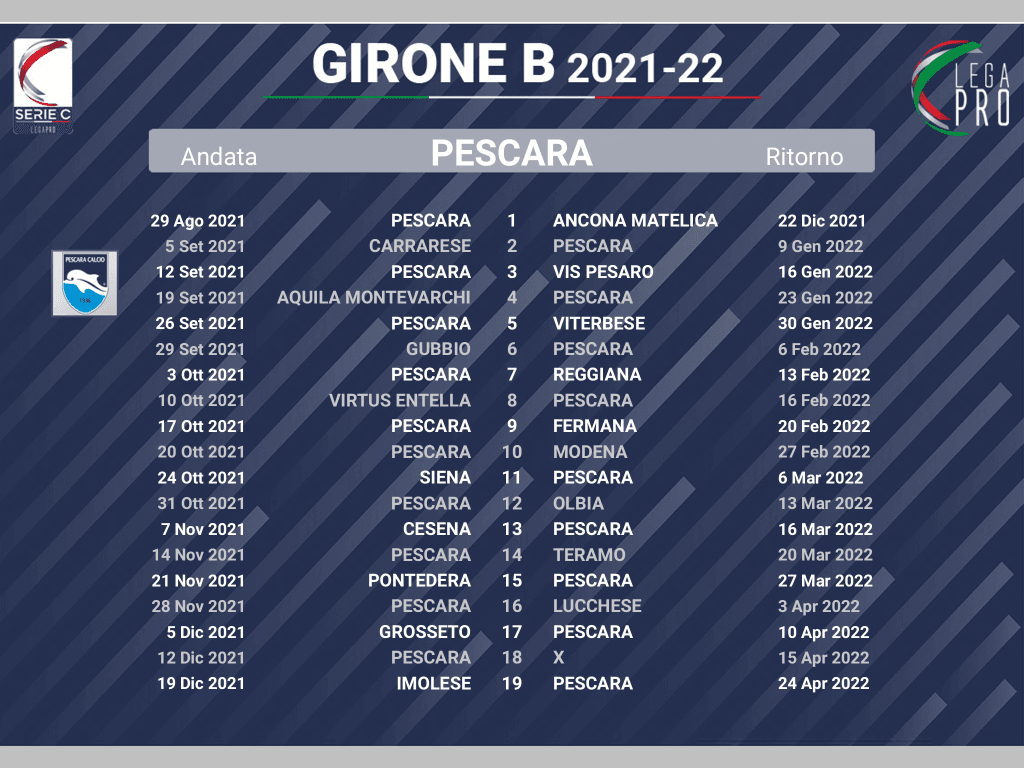 Il Pescara esordirà in casa, il 29 Agosto 2021, nel derby storico con l’Ancona-Matelica.