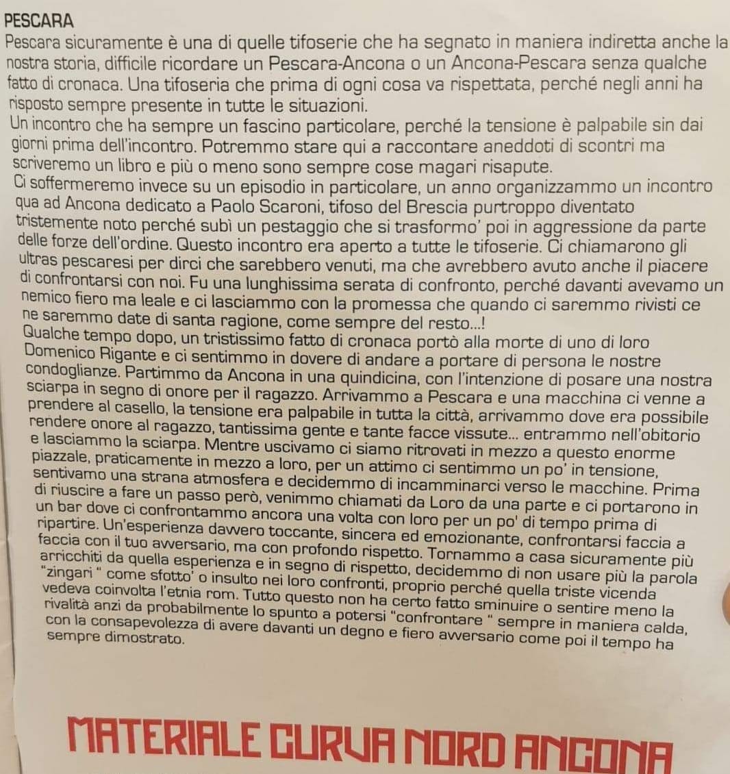 Qualche tempo dopo, un tristissimo fatto di cronaca portò alla morte di uno di loro, DOMENICO RIGANTE, e ci sentimmo in dovere di andare a portare di persona le nostre condoglianze. Partimmo da Ancona in una quindicina, con l’intenzione di posare una nostra sciarpa in segno di onore per il ragazzo. Arrivammo a Pescara e una macchina ci venne a prendere al casello, la tensione era palpabile in tutta la città, arrivammo dove era possibile rendere onore al ragazzo, tantissima gente e tante facce vissute… entrammo nell’obitorio e lasciammo la sciarpa. Mentre uscivamo ci siamo ritrovati in mezzo a questo enorme piazzale, praticamente in mezzo a loro, per un attimo ci sentimmo un po’ in tensione, sentivamo una strana atmosfera e decidemmo di incamminarci verso le macchine. Prima di riuscire a fare un passo però, venimmo chiamati da Loro da una parte e ci portarono in un bar dove ci confrontammo ancora una volta con loro per un po’ di tempo prima di ripartire. Un’esperienza davvero toccante, sincera ed emozionante, confrontarsi faccia a faccia con il tuo avversario, ma con profondo rispetto. Tornammo a casa sicuramente più arricchiti da quella esperienza e in segno di rispetto, decidemmo di non usare più la parola ‘zingari’ come sfottò o insulto nei loro confronti, proprio perché quella triste vicenda vedeva coinvolta l’etnia rom. Tutto questo non ha certo fatto sminuire o sentire meno la rivalità anzi da probabilmente lo spunto a potersi ‘confrontare’ con la consapevolezza di avere davanti un degno e fiero avversario come poi il tempo ha sempre dimostrato”.