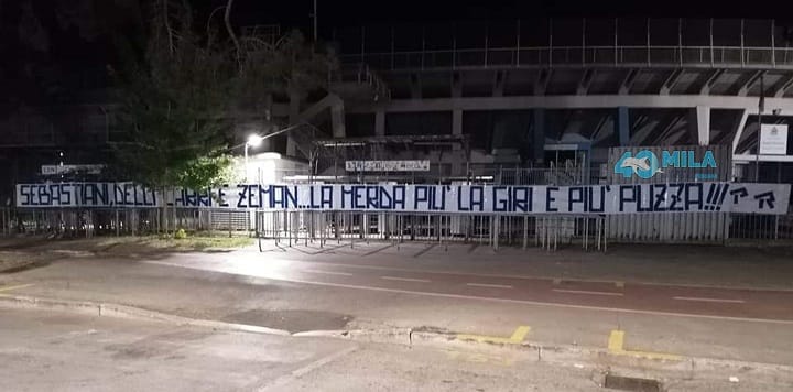 Lo striscione cita i nomi di SEBASTIANI, DELLI CARRI e ZEMAN.