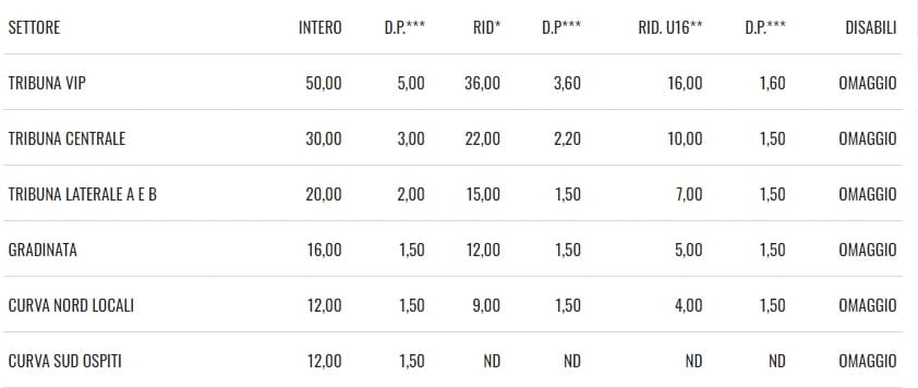 * IL RIDOTTO SI APPLICA A FAVORE DEGLI OVER 65, UNDER 25 STUDENTI, DONNE, ACCOMPAGNATORI DISABILI AD ESCLUSIONE DELLA CURVA OSPITI DOVE NON SONO PREVISTE RIDUZIONI;