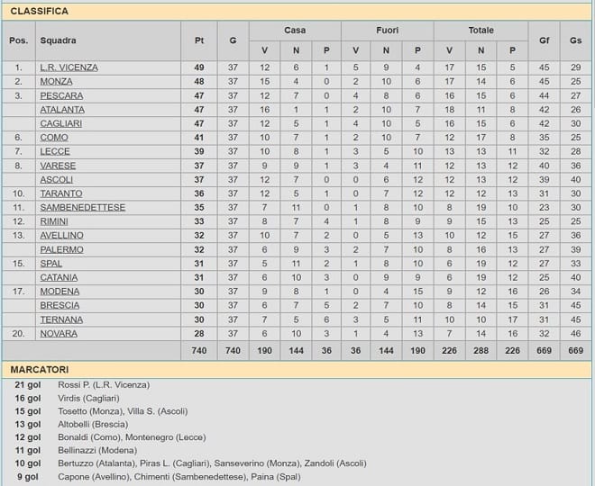 Né mi pare di importanza secondaria osservare che il Pescara infligge a Vicenza, Taranto e Lecce la loro unica sconfitta interna di tutto il campionato, peraltro interrompendo (in tutti e tre i casi) un lungo periodo di imbattibilità.
