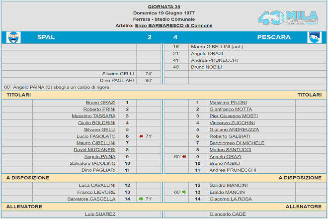 Il tifo, di entrambe le tifoserie, si azzera del tutto, poiché lo stadio ferrarese diventa un gigantesco impianto stereo concentrato sui campi di Cagliari, Modena e Bergamo, al punto che hanno portato una radiolina anche nelle due panchine, di Cadè e Suarez … tanto per capire a che livello di tensione siamo arrivati. E i risultati in campo si vedono subito: il Pescara “cammina” e presta molta più attenzione alla panchina (dove c’è la radio) che non al pallone. La Spal idem, ma se finora non era riuscita neanche ad avvicinarsi alla nostra area di rigore, ora ha quattro clamorose occasioni da gol, non riuscendo a trasformarne in gol neanche una, nonostante il nostro “prego, s’accomodi” a dir poco sfacciato; roba da “Ufficio Inchieste”.