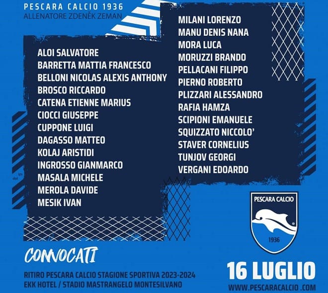 Nel comunicare “di aver acquisito a titolo definitivo dall’US Lecce le prestazione sportive del calciatore Roberto Pierno”, la Delfino Pescara 1936 Spa ha anche diramato la lista dei convocati per l’inizio del ritiro “in casa” con mister Zdenek ZEMAN tra EKK e Montesilvano.