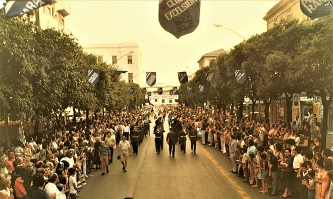 Subito dopo, il gonfalone storico del Club Excelsior, e quindi le sei auto decapottabili, la prima delle quali ha ancorata sul cofano una grossa coppa (alta 130 cm.), adeguatamente infiocchettata di biancazzurro; a chi sia destinata, per il momento resta un mistero.