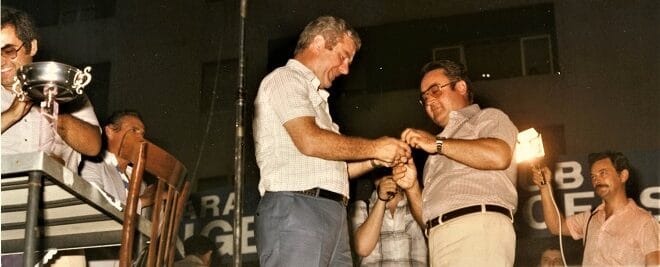 Quindi è il turno dei dirigenti e, con un’astuzia senza pari, il signor Manzo chiama per primo il Commendatore. Sì, perché il Presidente della prima Serie A è e resta lui. Il Presidente più amato dal 1936 ad oggi è e resta lui. Il Presidente “del secolo” è e resta lui. Questa sera, su questo palco, non c’è posto per nessun altro, tantomeno per “ombre” e “apparenti”. Il signor Manzo chiama Armando Caldora e piazza Salotto è al collasso. Un boato da fare spavento … spavento reale che i vetri delle finestre soprastanti ci piovano addosso. Gli viene consegnata la gigantesca coppa che era sull’auto di testa durante la sfilata, gigantesca come è stata la sua Presidenza. Avrà anche tutti i difetti di questo mondo, alcuni dei quali innegabili, ma è il Presidente che ci ha portato in Serie A, è il Presidente “uno di noi”, e tanto basta per farne un “monumento” del calcio Pescarese, che dubito fortemente possa essere eguagliato in futuro; anche se lo speriamo con tutto il cuore. La commozione del momento è autentica, ma viene subito interrotta (e forse è un bene) poiché il “dovere” impone di chiamare anche gli altri dirigenti.