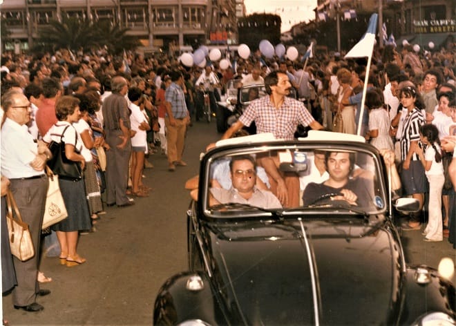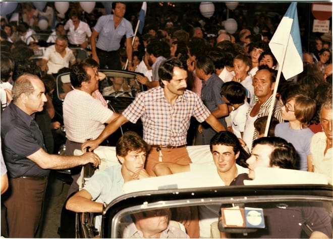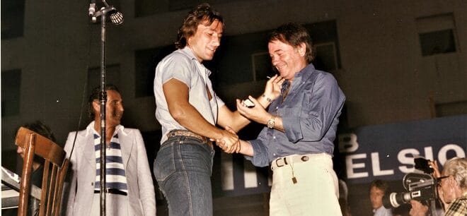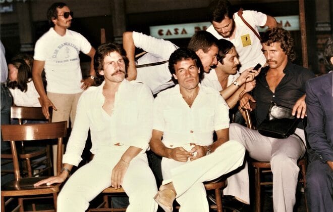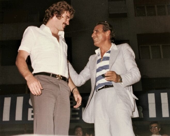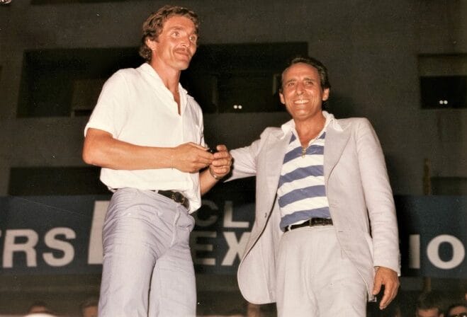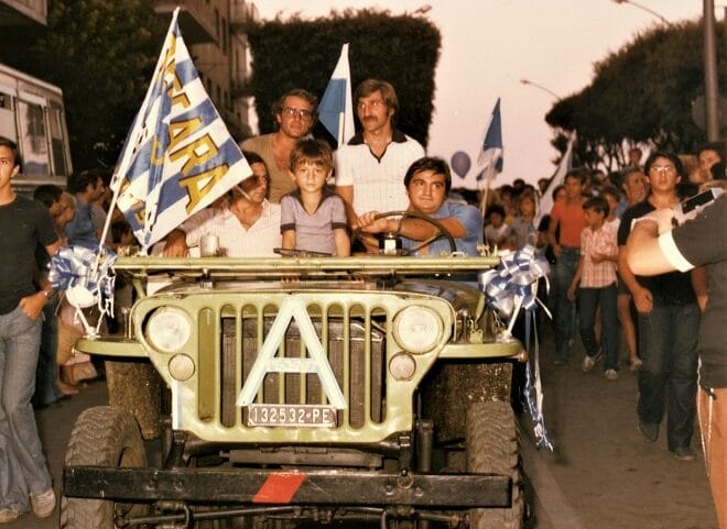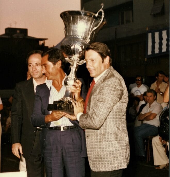 A sx Piero Aggradi. Sull’auto: Gianni De Biasi (dietro) e il massaggiatore Italo Rapino (davanti). Sulla dx in 1a fila tra la folla, Ivo Melatti. Sull’auto seguente Giuliano Andreuzza (in piedi)