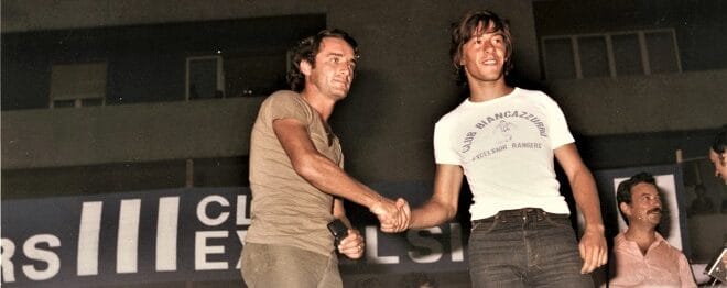 Gli fa eco Pomilio che ci raggiunge nel piazzale dove abbiamo parcheggiato i pullman e, improvvisando un piccolo discorso, ringrazia quasi commosso, anche a nome dei giocatori e di D’Altrui, per “il tifo eccezionale dei nostri Rangers” (parole testuali); e ci dà appuntamento all’anno prossimo, chiedendoci sin da ora la nostra disponibilità almeno per le partite più importanti. La Serie A non deve sfuggire assolutamente. Dopodiché mi chiama da parte e mi consegna 50.000 lire, con la preghiera di dividerle con tutti gli altri come simbolico segno di gratitudine.