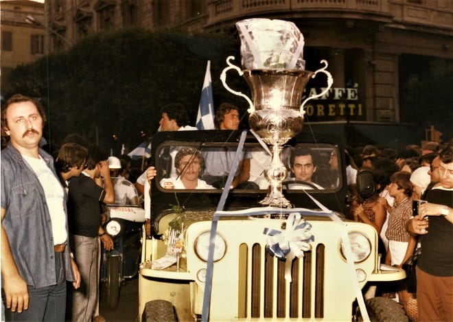 All’ingresso in corso Umberto siamo al delirio più totale perché, oltre a tutto il resto, si ripete la stessa scena del 4 luglio: confetti e petali di fiori che piovono addosso ai giocatori sia da finestre e balconi, sia dai due marciapiedi. Solo che questa volta l’effetto è infinitamente superiore, perché i nostri Campioni sono su auto scoperte e non al chiuso di un pullman.
