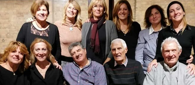 La Marty Pescara della 1ª promozione in A ritrovatasi nel 2021 – Il tecnico Marcello Perazzetti, il prof. Mario Bernardi, l’ing. Vittorio Pomilio, le giocatrici Luciana Perugini, Mali’ e Maria Vittoria Pomilio, Alessandra Mezzanotte, Stefania e Nicoletta Mariotti, Daniela e Fabrizia D’Ambrosio