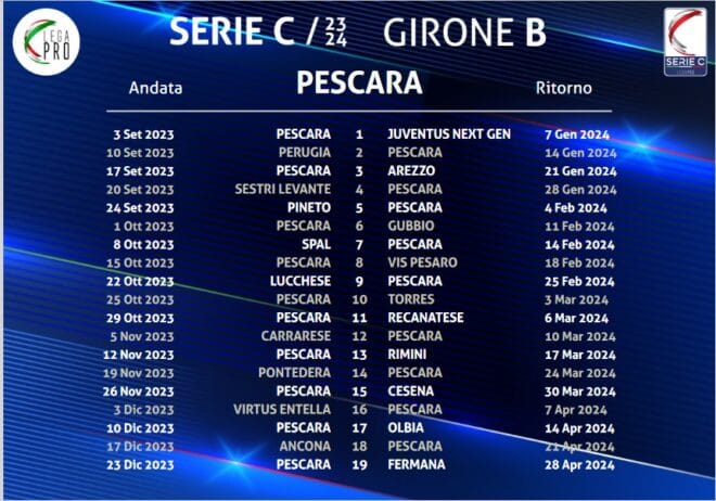 Ufficializzato dalla Lega Pro (qui il link) il calendario del prossimo campionato di Serie C, con il Pescara – come noto – inserito nel relativo Girone B.