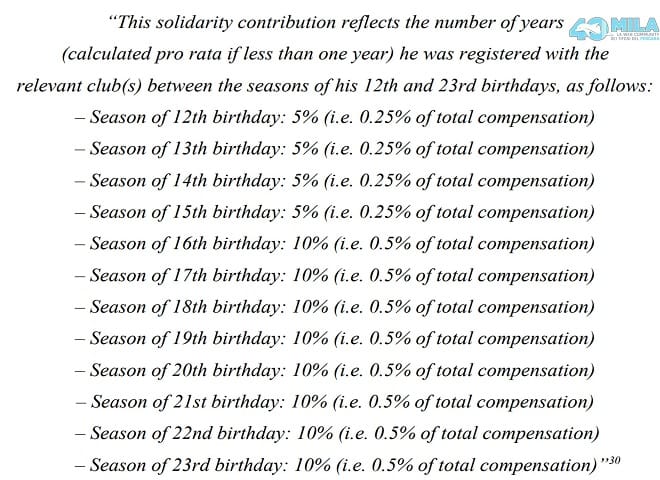 E CON CIO’?!? Pensate un po’, esiste una norma del FIFA Regulations on the Status and Transfer of Players (RSTP) che dice più o meno che ogni club che ha contribuito alla formazione del professionista deve ricevere una percentuale del prezzo pagato: il contributo di solidarietà. E un Allegato all’RSTP aggiunge la percentuale: “5%” del valore di trasferimento. Un 5% che, per esempio, su €50 milioni vale €2,5 milioni, no?