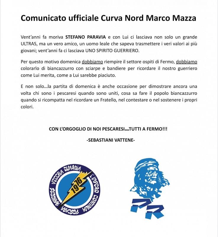 E non solo…la partita di domenica è anche occasione per dimostrare ancora una volta chi sono i pescaresi quando sono uniti, cosa sa fare il popolo biancazzurro quando si ricompatta nel ricordare un Fratello, nel contestare o nel sostenere i propri colori.