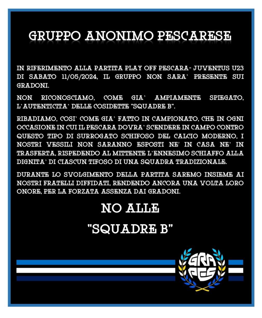 “IN RIFERIMENTO ALLA PARTITA PLAY OFF PESCARA-JUVENTUS U23 DI SABATO 11/05/2024, IL GRUPPO NON SARA’ PRESENTE SUI GRADONI.