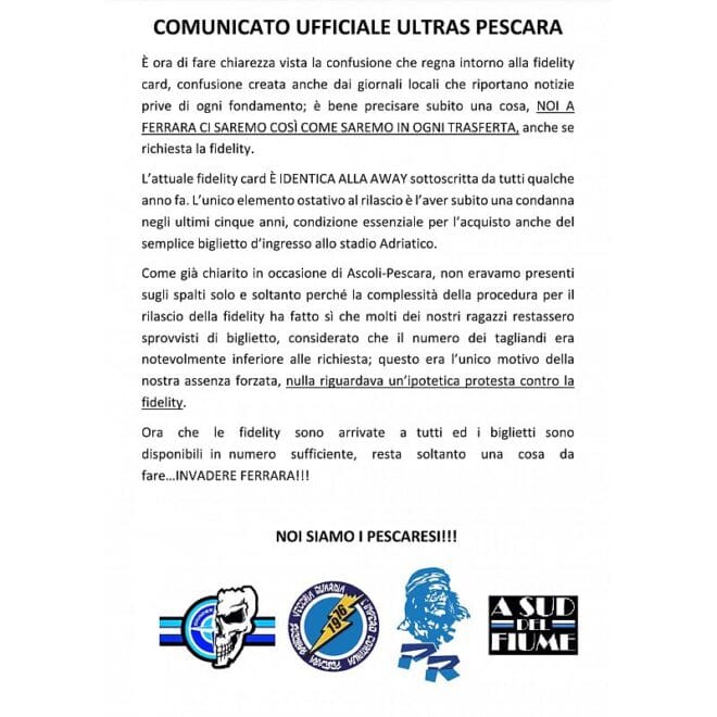 “È ora di fare chiarezza vista la confusione che regna intorno alla fidelity card, confusione creata anche dai giornali locali che riportano notizie prive di ogni fondamento; è bene precisare subito una cosa, NOI A FERRARA CI SAREMO COSÌ COME SAREMO IN OGNI TRASFERTA, anche se richiesta la fidelity. L’attuale fidelity card È IDENTICA ALLA AWAY sottoscritta da tutti qualche anno fa. L’unico elemento ostativo al rilascio è l’aver subito una condanna negli ultimi cinque anni, condizione essenziale per l’acquisto anche del semplice biglietto d’ingresso allo stadio Adriatico. Come già chiarito in occasione di Ascoli-Pescara, non eravamo presenti sugli spalti solo e soltanto perché la complessità della procedura per il rilascio della fidelity ha fatto sì che molti dei nostri ragazzi restassero sprovvisti di biglietto, considerato che il numero dei tagliandi era notevolmente inferiore alle richiesta; questo era l’unico motivo della nostra assenza forzata, nulla riguardava un’ipotetica protesta contro la fidelity. Ora che le fidelity sono arrivate a tutti ed i biglietti sono disponibili in numero sufficiente, resta soltanto una cosa da fare…INVADERE FERRARA!!! NOI SIAMO I PESCARESI!!!”