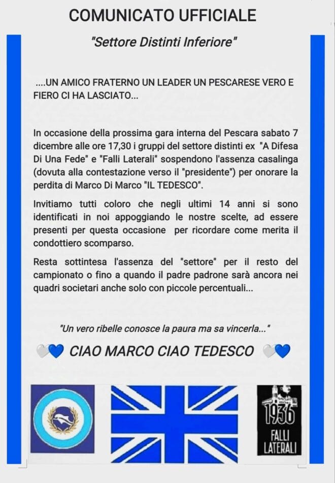 In occasione della prossima gara interna del Pescara sabato 7 dicembre alle ore 17,30 i gruppi del settore distinti ex “A Difesa Di Una Fede” e “Falli Laterali” sospendono l’assenza casalinga (dovuta alla contestazione verso il “presidente”) per onorare la perdita di Marco Di Marco “IL TEDESCO”