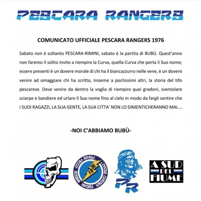 Sabato non è soltanto PESCARA-RIMINI, sabato è la partita di BUBÙ. Quest’anno non faremo il solito invito a riempire la Curva, quella Curva che porta il Suo nome; essere presenti è un dovere morale di chi ha il biancazzurro nelle vene, è un dovere venire ad omaggiare chi ha scritto, insieme a pochissimi altri, la storia del tifo pescarese. Deve venire da dentro la voglia di riempire quei gradoni, sventolare sciarpe e bandiere ed urlare il Suo nome fino al cielo in modo da fargli sentire che I SUOI RAGAZZI, LA SUA GENTE, LA SUA CITTA’ NON LO DIMENTICHERANNO MAI… – NOI C’ABBIAMO BUBÙ –