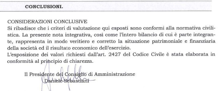 E come mai siamo ancora qui? Ci siamo ancora perché “l’azionista di maggioranza Daniele SEBASTIANI ha provveduto ad eseguire finanziamenti in conto futuro aumento di capitale per complessivi € 2.735.841” (che si aggiungono ai finanziamenti similari della stagione precedente per €2.567.000).