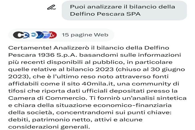 Post-Scriptum autoironico – Abbiamo provato a chiedere a “Grok”, l’intelligenza artificiale messa a disposizione da Elon Musk, la seguente domanda: “puoi analizzare il bilancio della Delfino Pescara SPA?”. Qui sotto trovate la risposta!