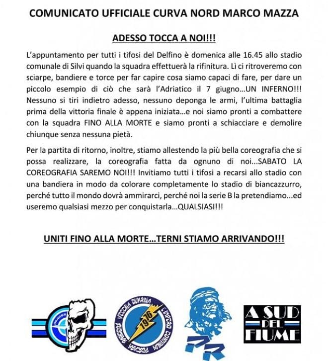 L’appuntamento per tutti i tifosi del Delfino è domenica alle 16.45 allo stadio comunale di Silvi quando la squadra effettuerà la rifinitura. Lì ci ritroveremo con sciarpe, bandiere e torce per far capire cosa siamo capaci di fare, per dare un piccolo esempio di ciò che sarà l’Adriatico il 7 giugno…UN INFERNO!!!