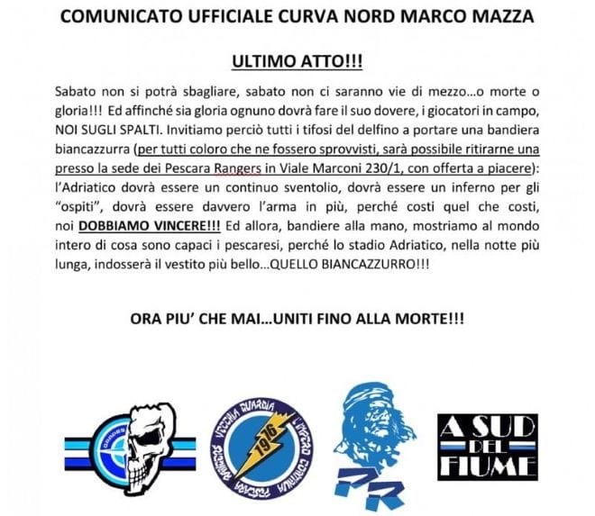 Sabato non si potrà sbagliare, sabato non ci saranno vie di mezzo…o morte o gloria!!! Ed affinché sia gloria ognuno dovrà fare il suo dovere, i giocatori in campo, NOI SUGLI SPALTI. Invitiamo perciò tutti i tifosi del delfino a portare una bandiera biancazzurra (per tutti coloro che ne fossero sprovvisti, sarà possibile ritirarne una presso la sede dei Pescara Rangers in Viale Marconi 230/1, con offerta a piacere):