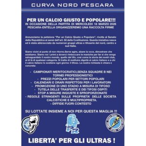 IN OCCASIONE DELLA PARTITA DI MERCOLEDI 18 MARZO 2026 PESCARA-ENTELLA ORGANIZZEREMO UNA RACCOLTA FIRME