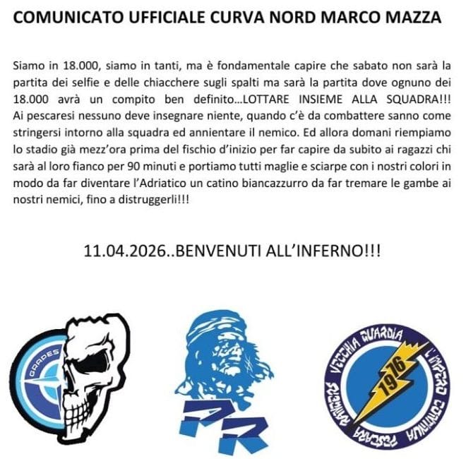 Ai pescaresi nessuno deve insegnare niente, quando c’è da combattere sanno come stringersi intorno alla squadra ed annientare il nemico. Ed allora domani riempiamo lo stadio già mezz’ora prima del fischio d’inizio per far capire da subito ai ragazzi chi sarà al loro fianco per 90 minuti e portiamo tutti maglie e sciarpe con i nostri colori in modo da far diventare l’Adriatico un catino biancazzurro da far tremare le gambe ai nostri nemici, fino a distruggerli!!!